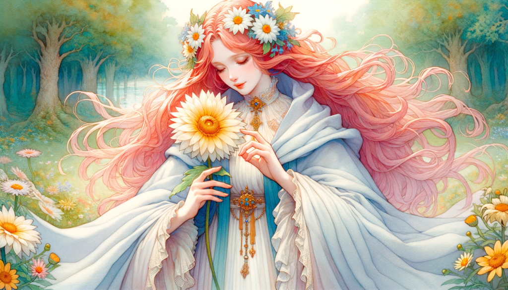 After taking her time to pick the most extraordinary of the fruits, Aurorae sat down by the Oak tree and joined Dianthe and Musea. She seemed less interested in worldly affairs than the other two, her long golden tresses danced about her shoulders as if they were constantly being teased by tiny fairies and is adorned with a pink magic star lily bloom. Her eyes were pale blue, and she seemed to be always looking things that no one else could see, this made her seem distracted, she would rarely look you in the eye, but when she did, her otherworldly looks only put you at ease, she was overflowing with a presence in those moments, that made you feel truly seen, it is just that she rarely looks.